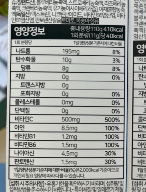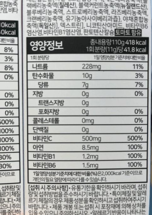 앞서 말씀드린 것처럼 아연, 비타민, 타우린, 판토텐산칼슘, 유기능 과일 성분등 인체에 도움이 되는 성분이 수십 가지가 포함되어 있습니다.